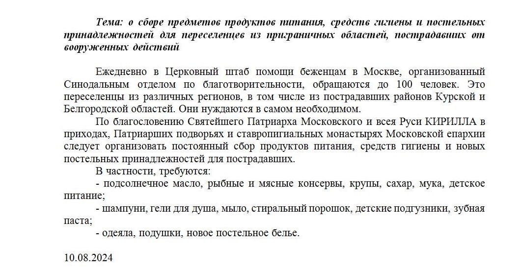 О сборе предметов продуктов питания, средств гигиены и постельных принадлежностей